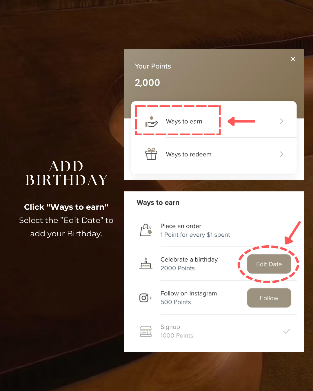 - Purchases made with discounts, Shop Pay installments, or redeemed points are not eligible for earning loyalty points.