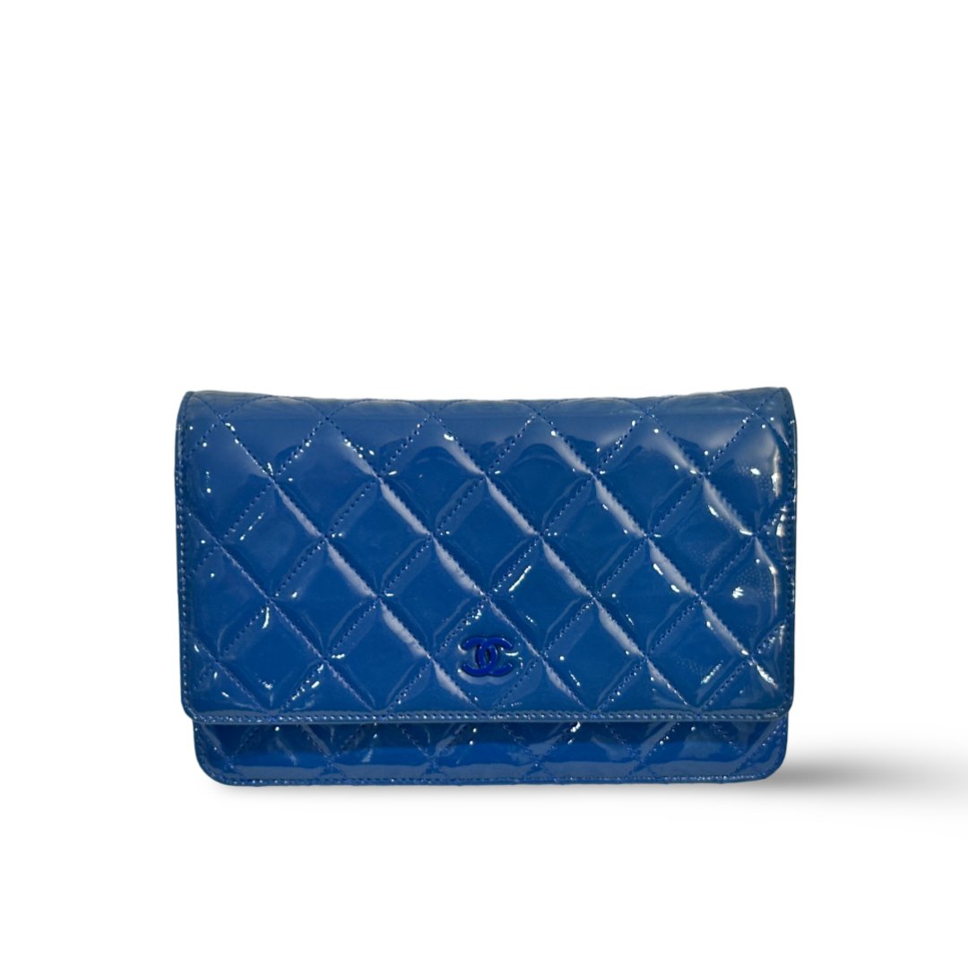 Chanel Classic Patent Quilted Wallet On Chain WOC Blue