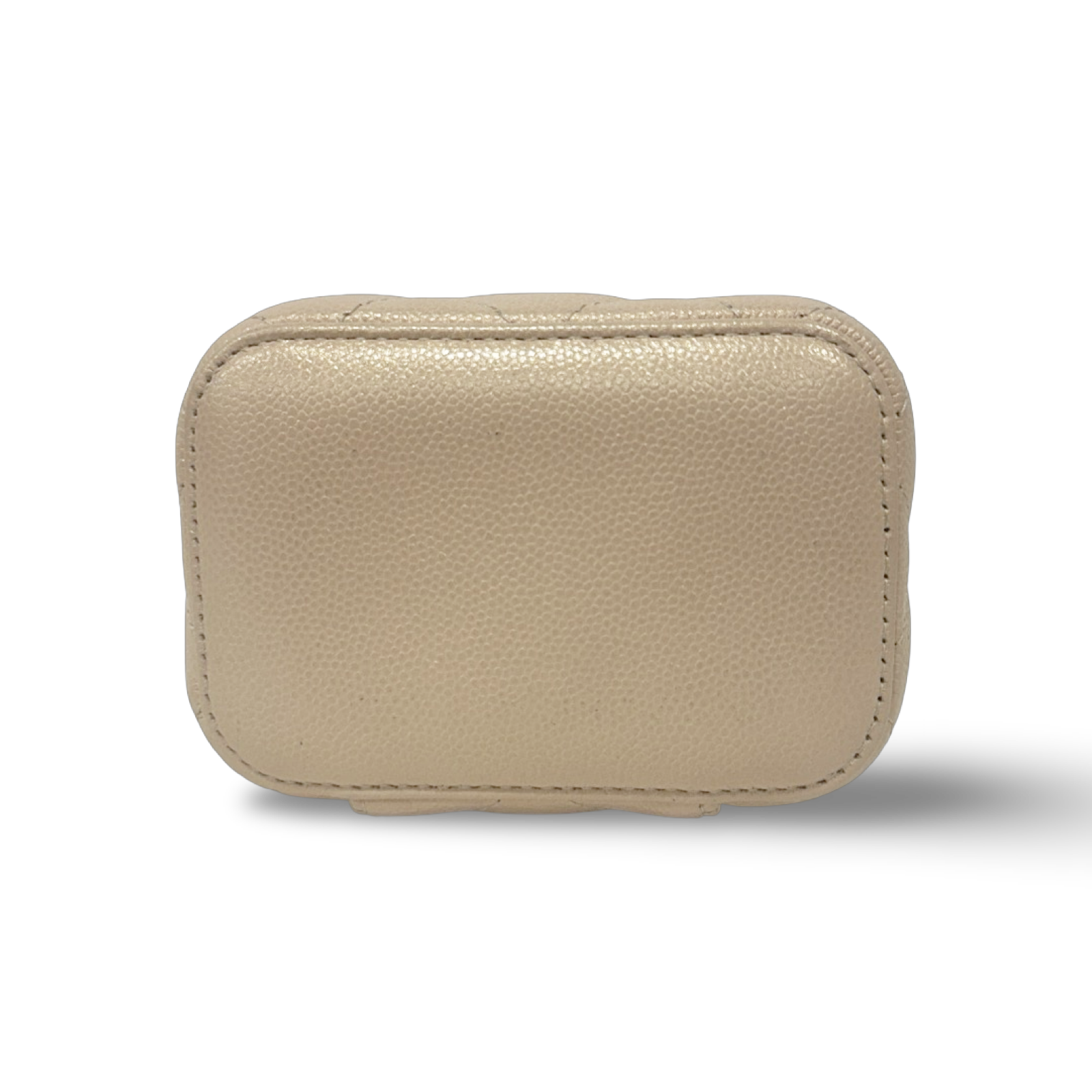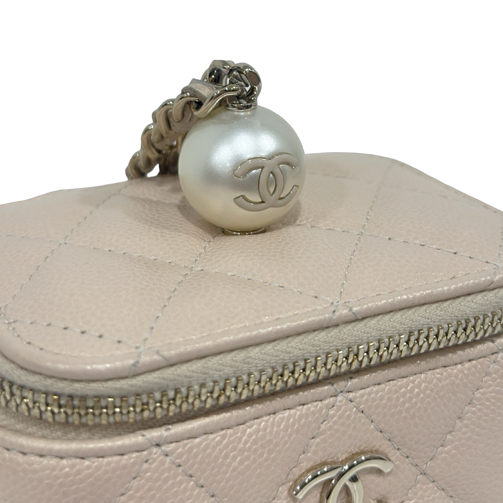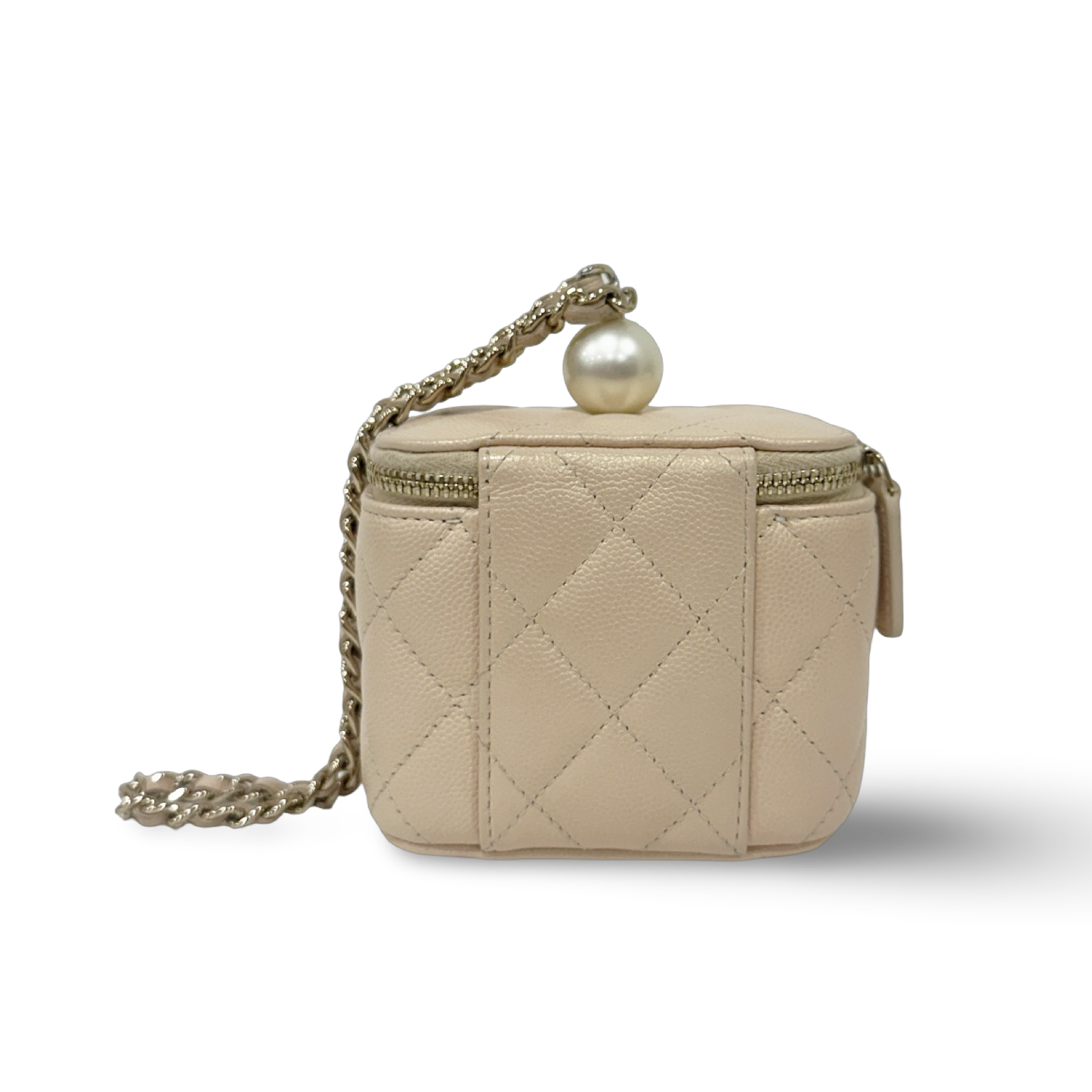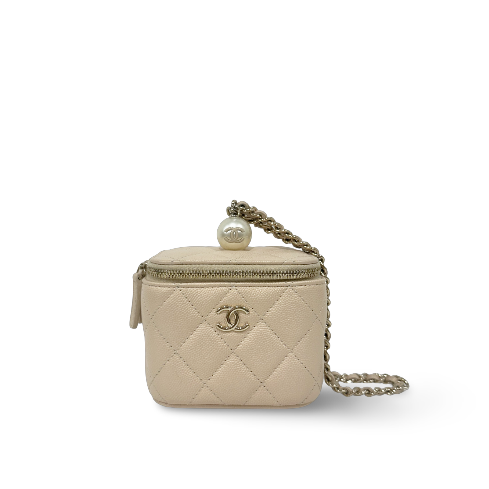 Chanel Quilted Caviar Pearl On Top Mini Vanity Case With Chain - GHW / Beige