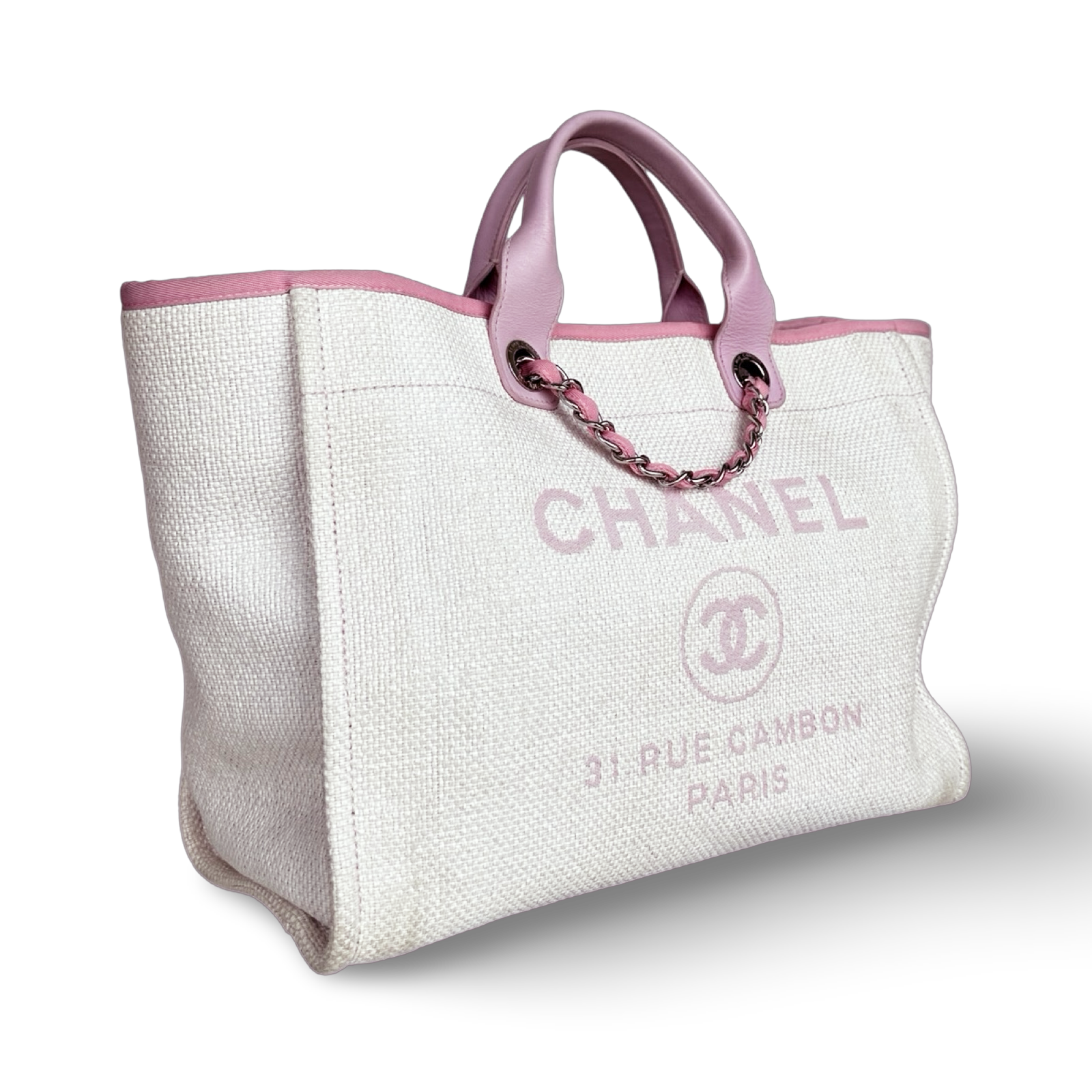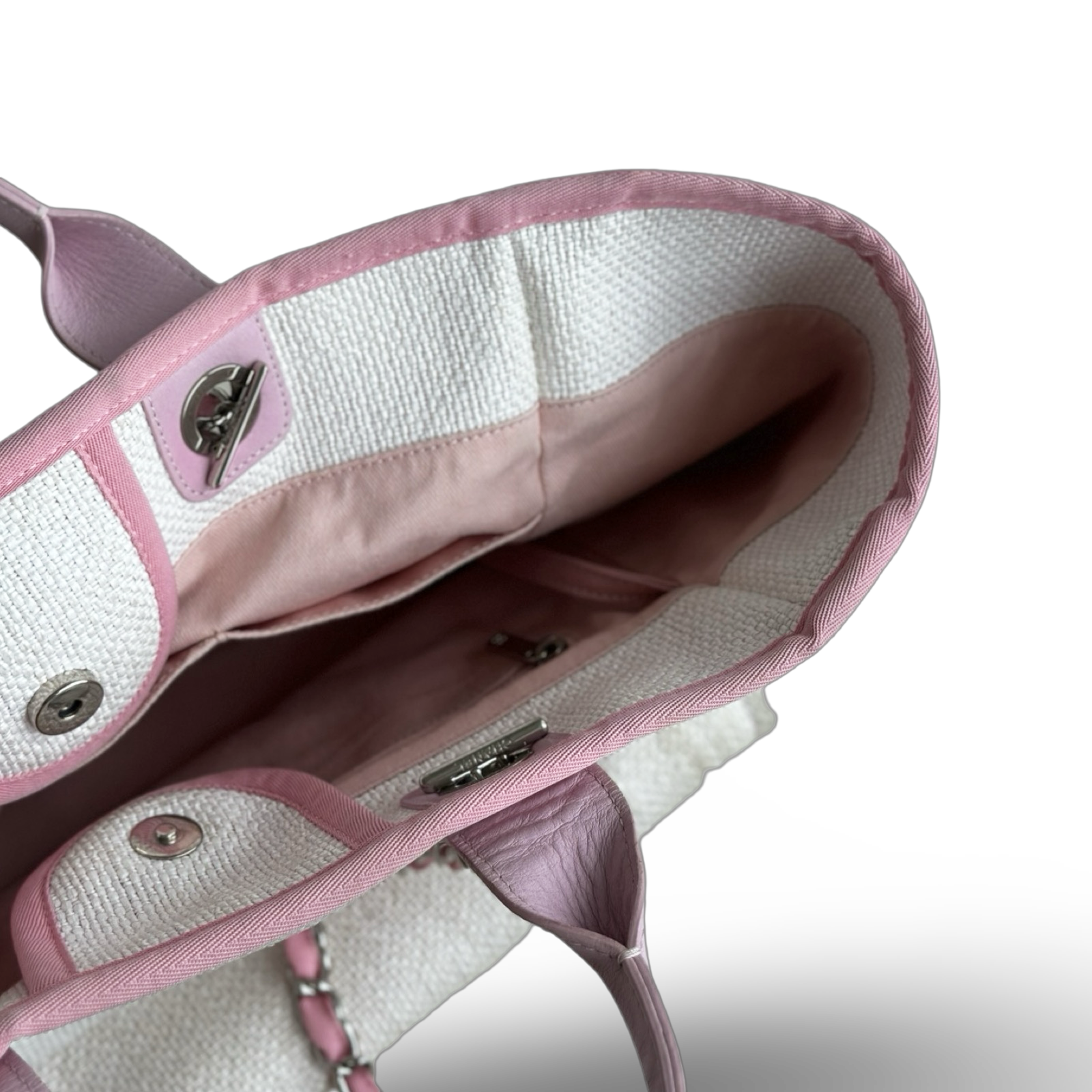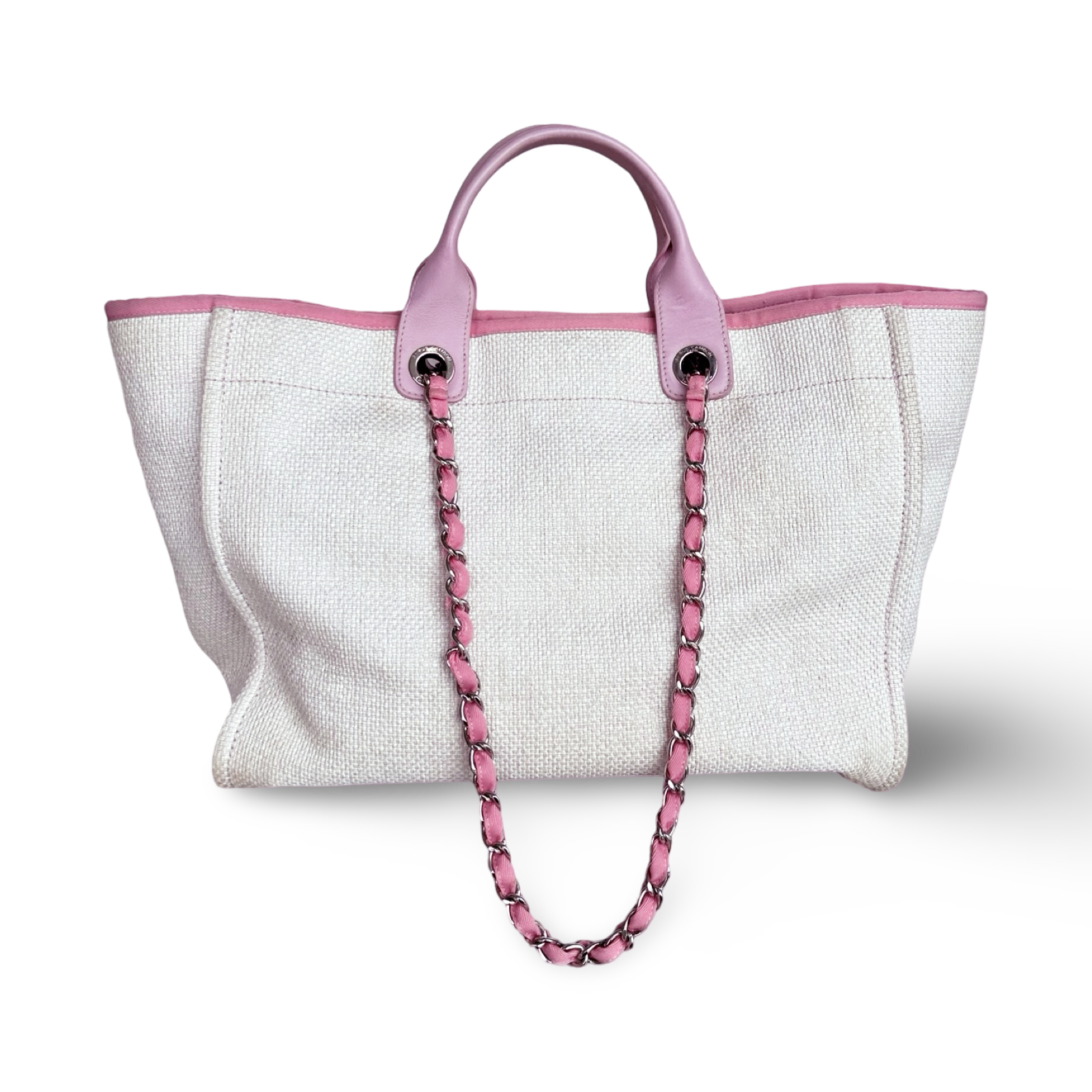 Chanel Straw Raffia Calfskin Chain Medium Deauville Tote - GHW / Pink