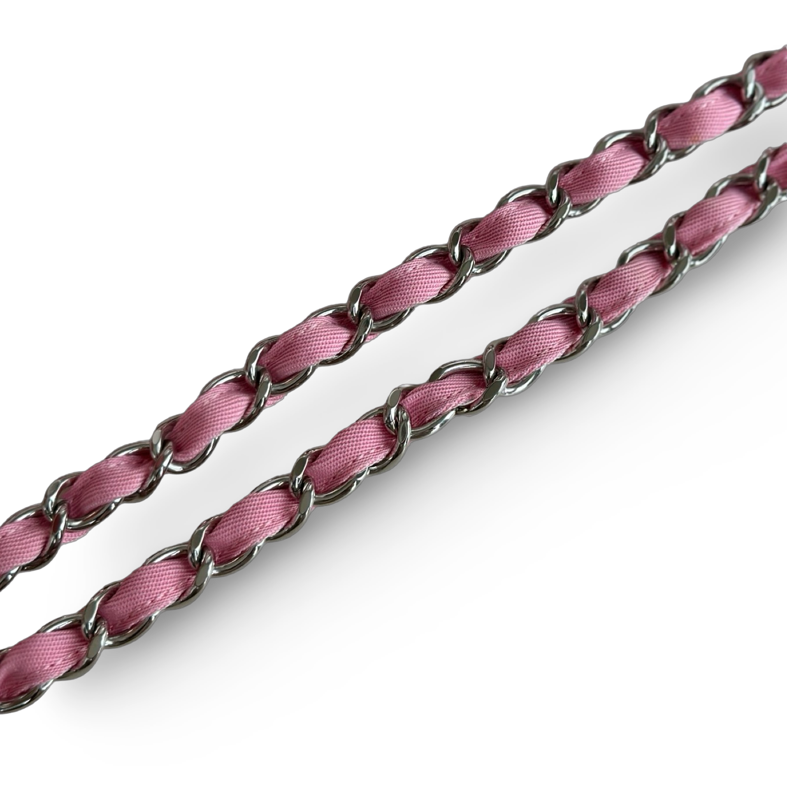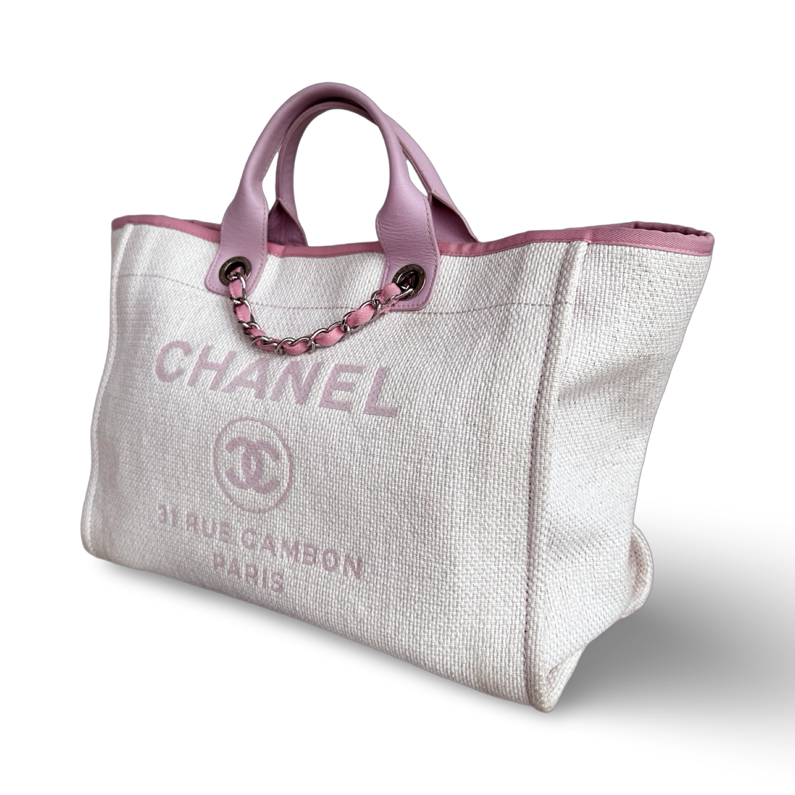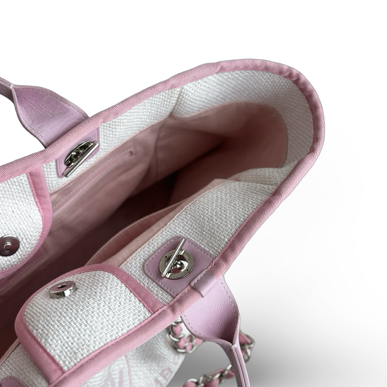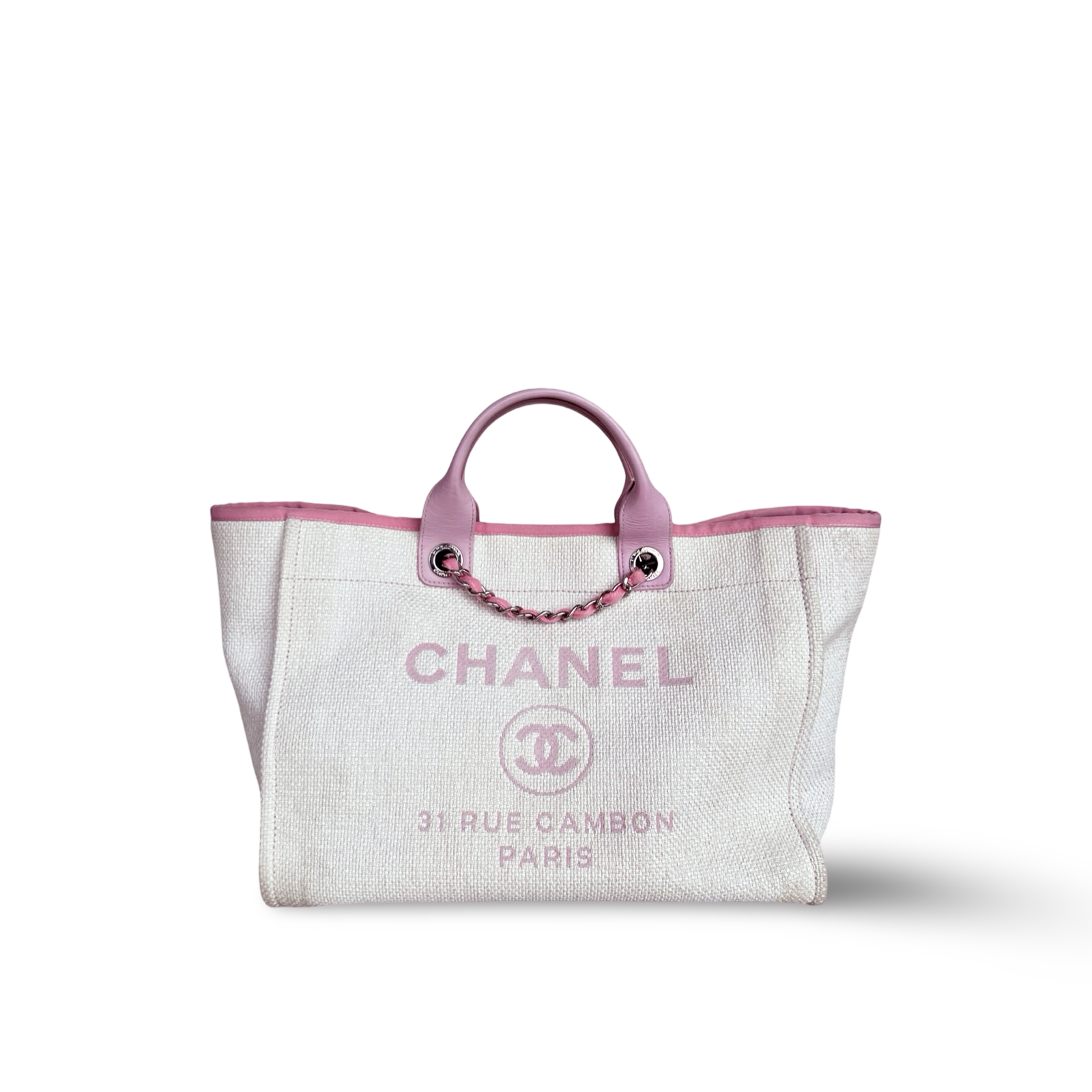 Chanel Straw Raffia Calfskin Chain Medium Deauville Tote - GHW / Pink